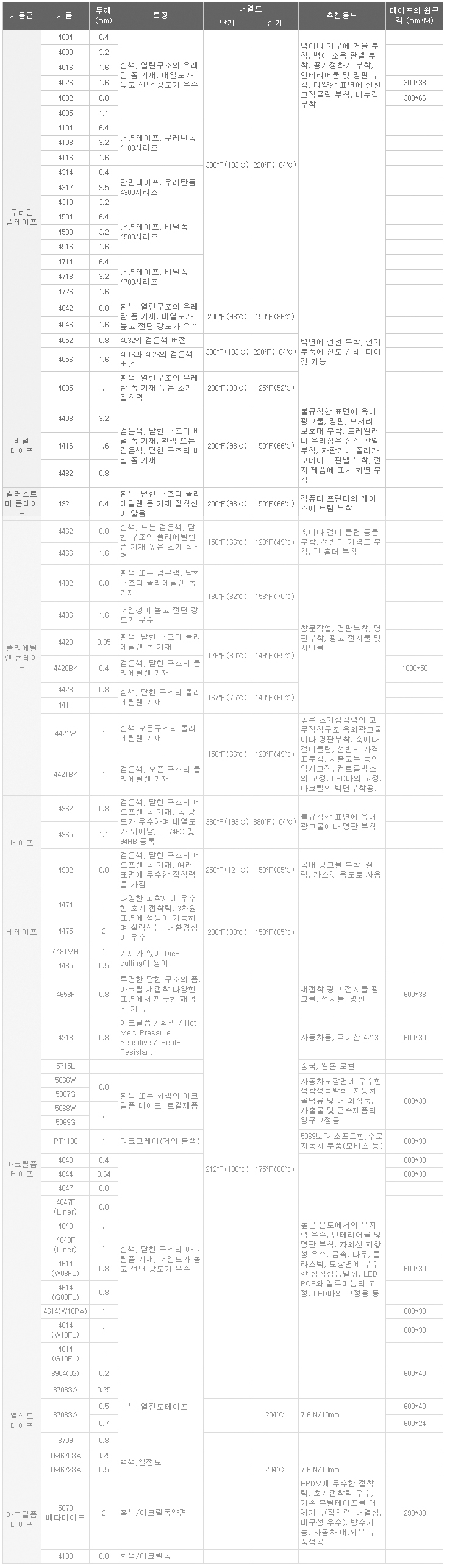 종류에 따라 실링 및 완충, 진동완화, 내충격성, 고온 및 저온에서의 성능, 차단효과 등이 뛰어나며, 여러 종류의 기재 재질-우레탄, 비닐, 일레스토머, 폴리에틸렌, 아크릴릭. 네오프렌-에 3M의 고무계 혹은 아크릴계 점착제가 도포되어 용도에 맞는 테이프를 다양하게 선택할 수있습니다.